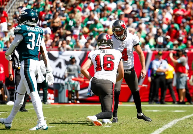Trenton Gill's first punt as a Buccaneer went 42 yards and was muffed by return man Cooper DeJean, with Russell recovering the ball at the Eagles' 22. The officials initially threw a penalty flag on Josh Hayes for fair catch interference but the flag was picked up when the officials ruled that Hayes had been blocked into the returner.