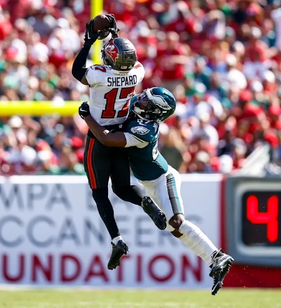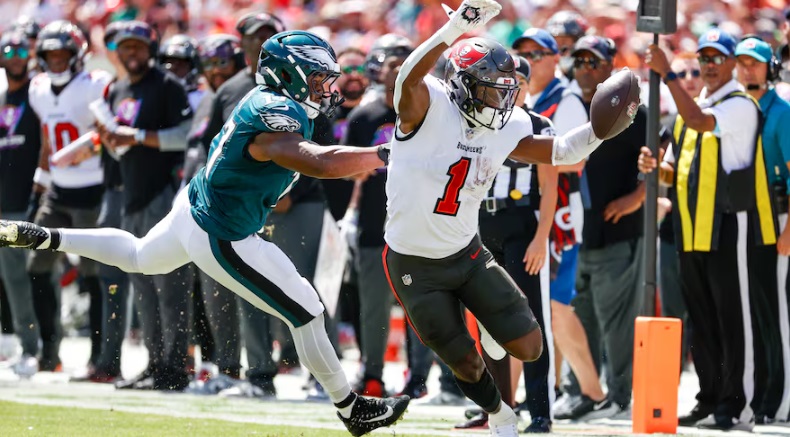 Mayfield completed passes to eight different players, and hit on touchdown throws to Mike Evans and Trey Palmer. Rookie RB Bucky Irving scored his first NFL touchdown on a one-yard sweep in the third quarter after the Eagles had pulled to within 10 points.