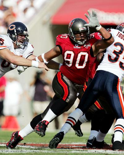 Those expectations were met early when Alex Brown—dominant all game—sacked Simms on Tampa Bay's third play from scrimmage, forcing a fumble that Tommie Harris recovered at the 1-yard line before many in the crowd of 65,506 had found their seats. One play later, Orton found tight end John Gilmore wide open in the corner of the end zone off play-action on a play added to the playbook just last week. The reception marked Gilmore's first career touchdown. "That was the easiest play all day," said Orton, who called Tampa Bay's defense the toughest he has faced this season. "We got the exact look that we wanted and executed."