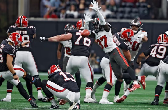 Let's roll the tape. The Bucs led four different times and blew them all. With 6:29 remaining in the game, Tavierre Thomas blocked Younghoe Koo's 54-yard field goal attempt and the Bucs took over at their own 44. They converted one first down before rookie running back Bucky Irving was stripped of the ball by Falcons safety Jessie Bates and linebacker Kaden Elliss recovered at the Atlanta 25.