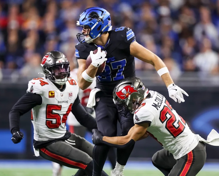 Mayfield never quite settled in, and played this game without Chris Godwin and Bucky Irving, with Mike Evans exiting in the first half with what was later announced as a broken collarbone. But credit the Detroit defense for coming through when necessary.
