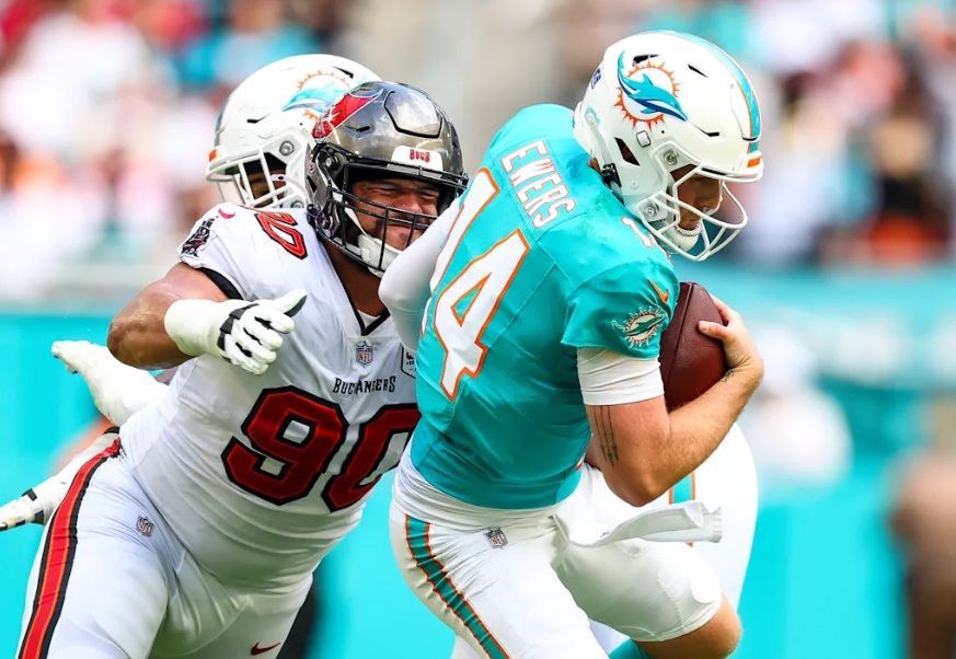 The Bucs led 7-0 after an almost eight-minute drive with Mayfield throwing a TD pass to Chris Godwin. But the Bucs gave the lead back quickly. Ewers connected on a 63-yard touchdown pass to Theo Wease on a definite coverage bust. It not only tied the score, but gave Ewers and the Dolphins confidence.