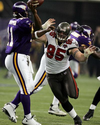 The Vikings eventually benched Johnson in favor of Adam Goldberg, but McFarland and former Vikings defensive tackle Chris Hovan already had made quick work of Johnson and center Cory Withrow. The Bucs finished with just two sacks, but Culpepper never looked comfortable; one of his fumbles came when Bucs defensive end Simeon Rice stripped him from behind, while the other came when he unsuccessfully tried to pull back the ball when a short pass did not materialize. "We knew we couldn't just let him sit back there," said Kelly, the Tampa Bay cornerback. "We couldn't just let him pad his feet, pat the ball and let it go. We had to get some pressure on him, let the front four eat and throw some blitzes at him."