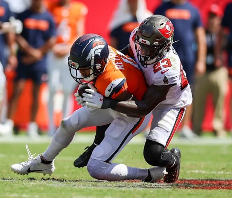 The Broncos went for it on fourth-and-inches and scored on a pitch to RB Javonte Williams. Denver tacked on a pair of Wil Lutz field goals in the second quarter but between those two drives the Bucs did regain some on a Lavonte David forced fumble that Logan Hall recovered, leading to a 67-yard touchdown drive featuring two big plays by Irving. Chris Godwin held on to a very difficult catch on a six-yard fade to score for the third time in as many games this season.