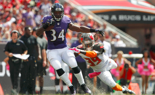 The Ravens got the ball first and picked up a first down on a swing pass to FB Kyle Juszcyk. On the next play, Forsett broke through the line and into the clear and wasn’t pushed out of bounds by S Major Wright until he hit the Bucs’ 15. A quick slant to Torrey Smith two plays later put the Ravens in the end zone just 1:49 into the game.