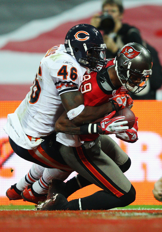 The Buccaneers scored next after an unusual trio of plays, all won by the two defenses. Jackson needed just one hand to pick off a pass that deflected off the hands of RB Marion Barber, and he returned it 43 yards to the Bears’ 12. On the Bucs’ next play, Freeman hit Williams at the one-yard line but the ball was bobbled and ended up in the arms of S Chris Conte for an interception at the two-yard line. Barber got around the right edge of the Bears’ line and trapped Forte, with help, before the back could get out of the end zone.