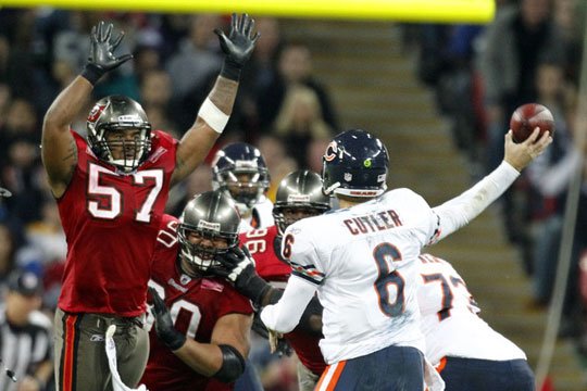 The Bears faced a third-and-three after DE Michael Bennett stopped Forte for no gain on second down, and Sanzenbacher’s pivot route in the middle didn’t get him open enough for Cutler’s lob to find him. The Bears’ punt was fair caught by Parker at the Bucs’ 41.