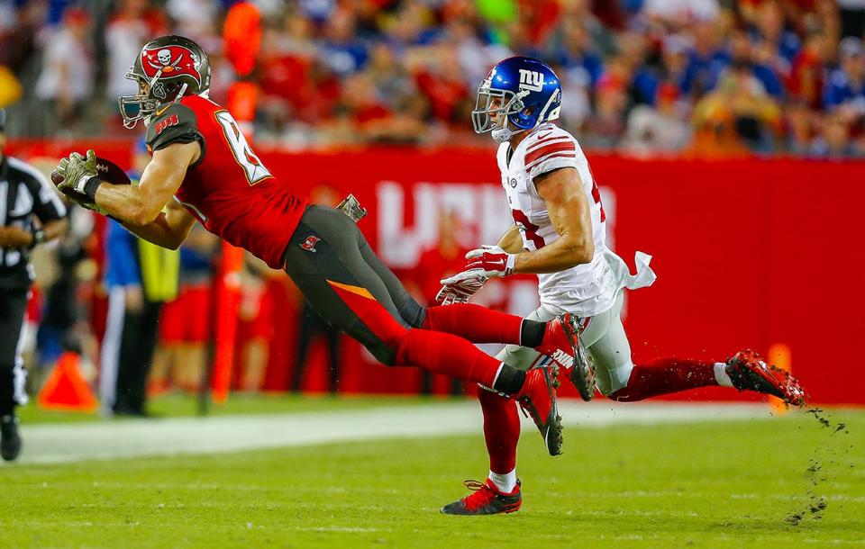 Winston enjoyed an enormous amount of time to throw on the first play of the ensuing drive and he found Evans wide open down the left numbers for a gain of 25. Humphries' third catch of the game created another first down at the Giants' 30 as the two-minute warning arrived.