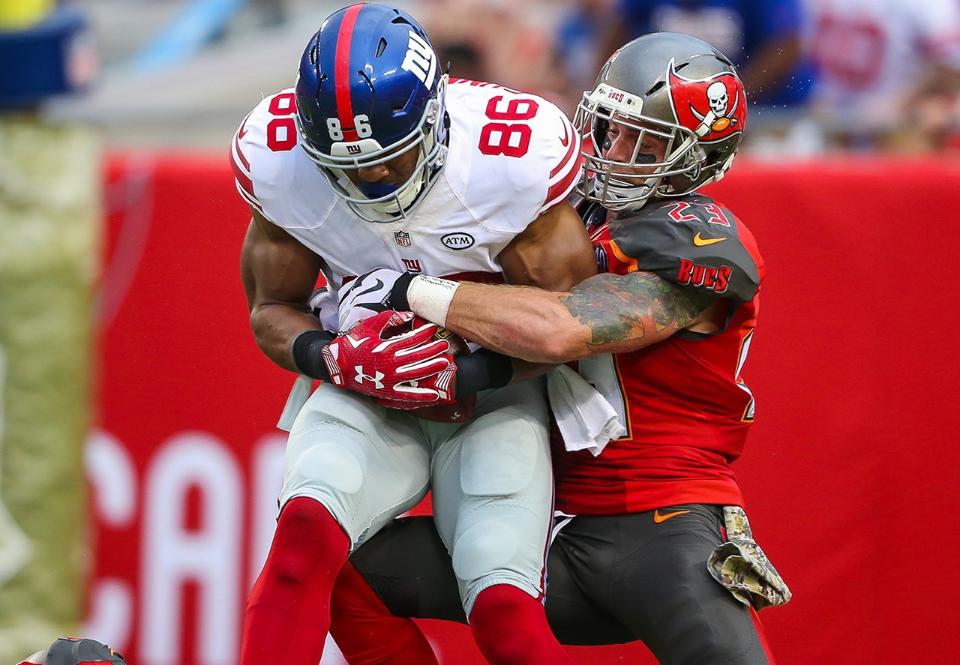 S Chris Conte broke up a potential touchdown pass to TE Will Tye to make it third-and-nine at the 17, and good coverage on the third-down play led to an incompletion. The Giants settled for a game-tying 35-yard field goal off the foot of K Josh Brown.