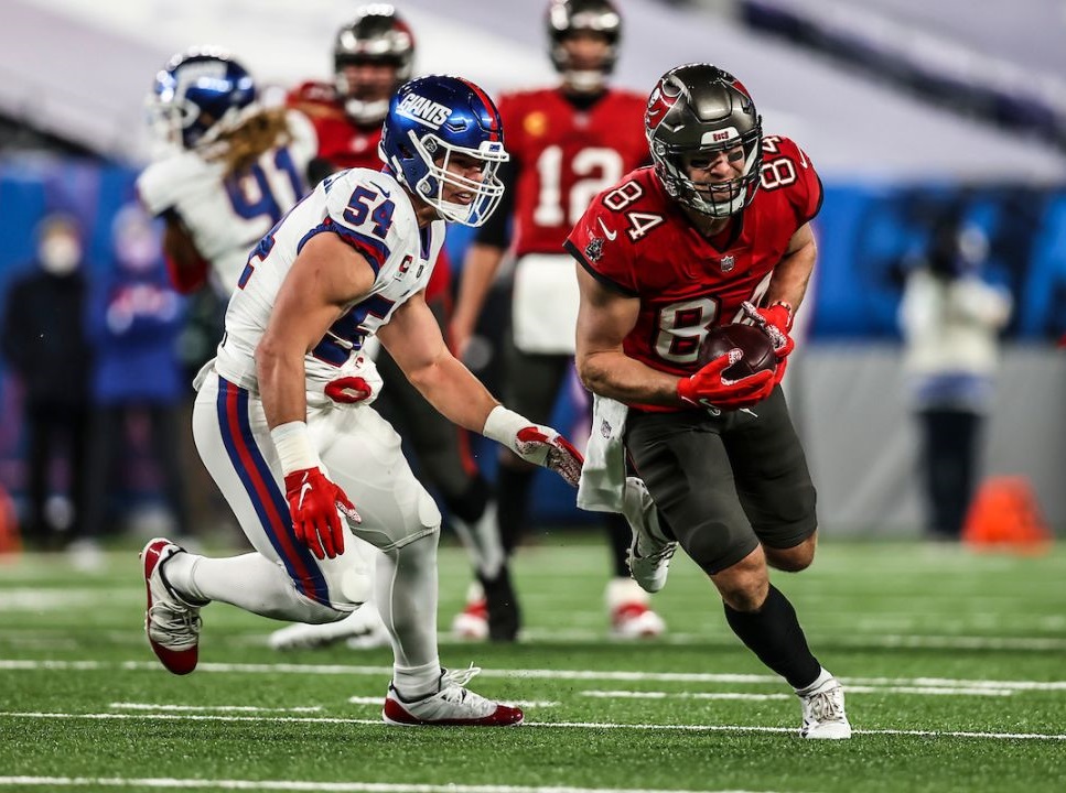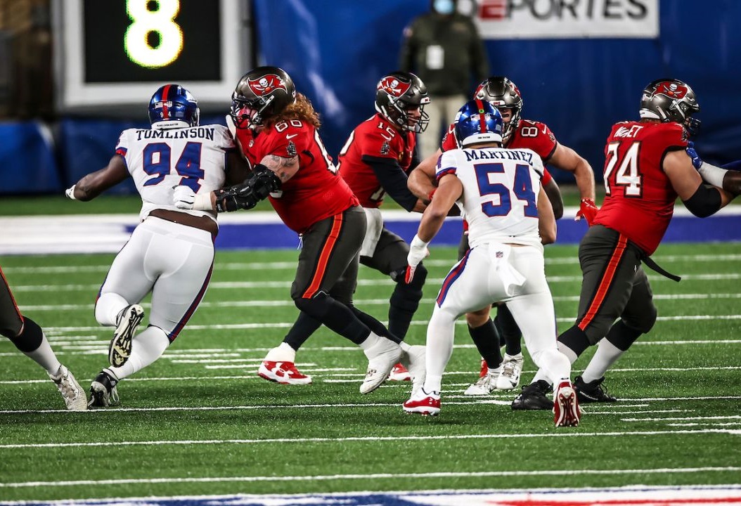 The Buccaneers' defense saw its streak of 13 straight games allowing fewer than 100 rushing yards come to an end as the Giants got to 101 with a mixture of Wayne Gallman, Alfred Morris (just elevated from the practice squad) and Jones on scrambles. But the defense turned up the pressure in the second half, as former Giant Jason Pierre-Paul and Ndamukong Suh both recorded sacks. ILB Devin White got Jones down in the first half for his fifth sack in the last three weeks.