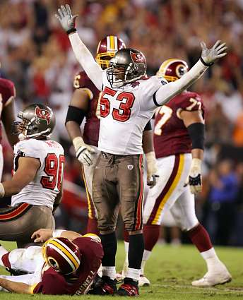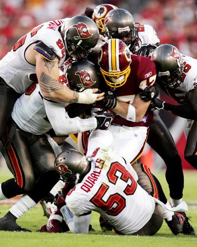 All the Chiefs had to do after their dramatic victory last week was celebrate after they walked off the field. Tampa Bay’s defense had to come up with one more stop. QB Mark Brunell completed a 24-yard pass to TE Chris Cooley to start Washington’s final drive, getting the visitors out to their own 44 with 46 seconds to play. That’s where the Bucs made their final stand, forcing three straight incompletions and a Brunell scramble on fourth down. DE Dewayne White grabbed Brunell from behind at the 46 to end the threat.