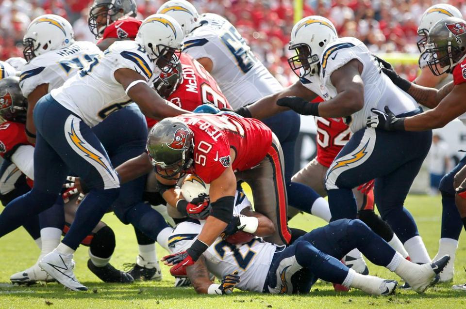 On the very next play, Freeman dropped back to pass, took a long time to survey the field and eventually found Underwood inside the five-yard line, cutting right to left. Freeman got him the ball and Underwood walked into the end zone untouched. Black was injured on the first play of the next drive while stopping Mathews for a loss of one. Two plays later, Rivers once again converted a long third down, hitting Alexander over the middle for a gain of 19 to the Chargers’ 40. Three plays later, it was the same thing – a quick slant to Alexander converted a third-and-four and gave San Diego another first down just inside Bucs territory.