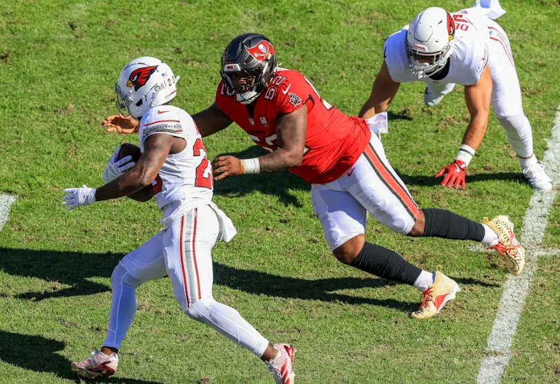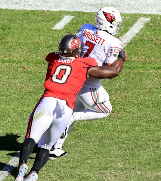 S Tykee Smith dropped Knight after a gain of just one on a first-down carry and DL Logan Hall chased Brissett into a throwaway on second down. The Bucs collapsed the pocket quickly on third down and Brissett's scramble up the middle came up three yards short, leading to Arizona's first punt, which Kam Johnson ran back to the Tampa Bay 30.