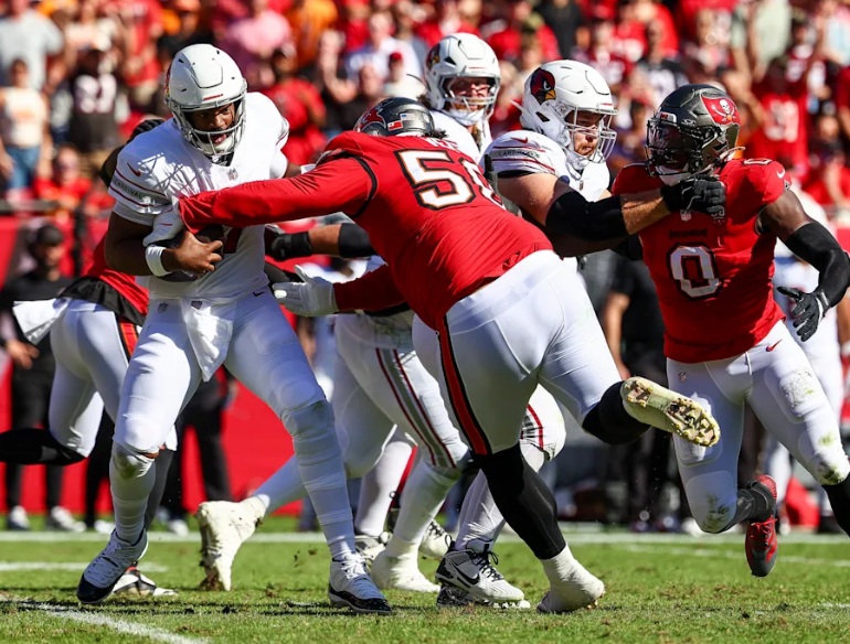 Brissett threw for 301 yards on 40 attempts but was intercepted in the red zone on the Cardinals' first possession and took two critical third-down sacks, one each by NT Vita Vea and OLB Yaya Diaby. His favorite target was TE Trey McBride, who caught eight passes for 82 yards and a touchdown, and he also found Knight on a 15-yard scoring pass in the third quarter.