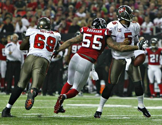Not that the giveaways were all Freeman’s fault. He lost the fumble when John Abraham stripped the ball from his hands after blowing by right tackle James Lee and threw one of his picks as a result of a classic 1976-like Bucs foul-up.