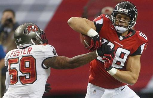 LB Mason Foster led the Bucs’ swarming defense with 12 tackles and rookie LB Lavonte David added six stops, a sack, a tackle for loss, two quarterback hits and a pass defensed. DE Daniel Te’o-Nesheim secured the Buccaneers’ other sack of Ryan. The Bucs secured the top spot in the NFL’s run defense ranking, holding the Falcons to 65 yards on 16 carries. RB Michael Turner scored on a 17-yard run following an Asante Samuel interception in the third quarter, but Turner gained just one yard on his other six totes. The Bucs’ defense also held Atlanta’s dangerous starting receivers, Julio Jones and Roddy White, to a combined 98 yards on eight catches.
