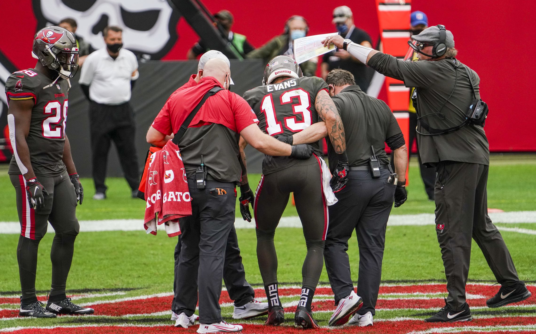 "It's definitely a roller coaster of emotions," receiver Chris Godwin said of Evans. "He breaks the record, and … I was so proud just of the man that Mike is and the way he works. I think that's awesome. Then, next play, he goes down. It hurts.