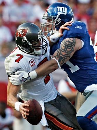 Michael Strahan and his Giants defensive mates did to Jeff Garcia on Sunday what the Bucs have done to quarterbacks for the past decade: They left him battered and bruised. Eleven times the Bucs quarterback was driven into the turf at Raymond James Stadium - and on several more occasions escaped more potential pummeling only by throwing desperately on the run.