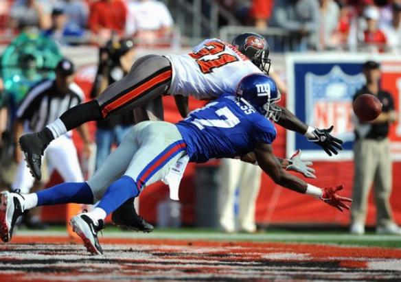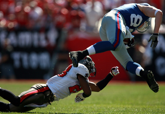 The Bucs' defense, already without starting strongside linebacker Cato June, lost another starter in the first half when rookie S Tanard Jackson left with a knee injury. Still, the league's second-ranked unit hit hard from the get-go and actually covered Giants receivers well downfield. S Jermaine Phillips led the way with 11 tackles and Brooks added 10. Adams had five tackles and an additional quarterback hit to go with his sack.